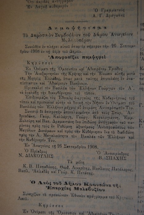 Τα ψηφίσματα αυτά δημοσιεύτηκαν στην επίσημη εφημερίδα της Κρητικής Πολιτείας η οποία ονομάστηκε «Παράρτημα της εφημερίδος της Κυβερνήσεως εν Κρήτη». Το ψήφισμα του Δήμου Ανωγείων έχει ημερομηνία 26 Σεπτεμβρίου 1908 :