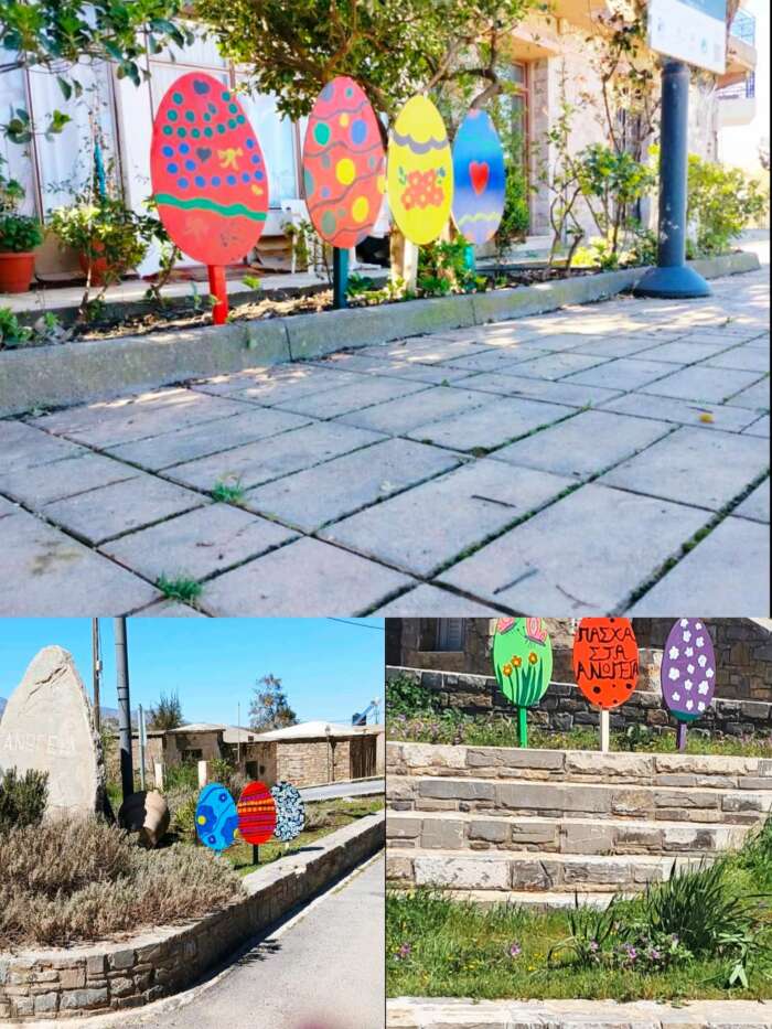Ξύλινα πασχαλινά αυγά τοποθετήθηκαν σε κεντρικά σημεία του χωριού, τα οποία φιλοτεχνήθηκαν με μεράκι και φαντασία από τους μαθητές των Ανωγείων. Μέσα από αυτή τη δράση, τα παιδιά έγιναν οι μικροί δημιουργοί της πασχαλινής ατμόσφαιρας του τόπου μας, δίνοντας ζωή στον δημόσιο χώρο και μεταφέροντας το μήνυμα της αναγέννησης και της ελπίδας.