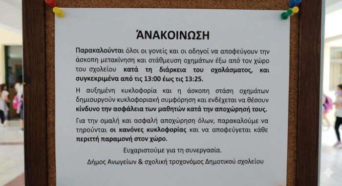 Παρακαλούνται όλοι οι γονείς και οι οδηγοί να αποφεύγουν την άσκοπη μετακίνηση και στάθμευση οχημάτων έξω από τον χώρο του σχολείου κατά τη διάρκεια του σχολάσματος, και συγκεκριμένα από τη 13:00 έως 13:25.